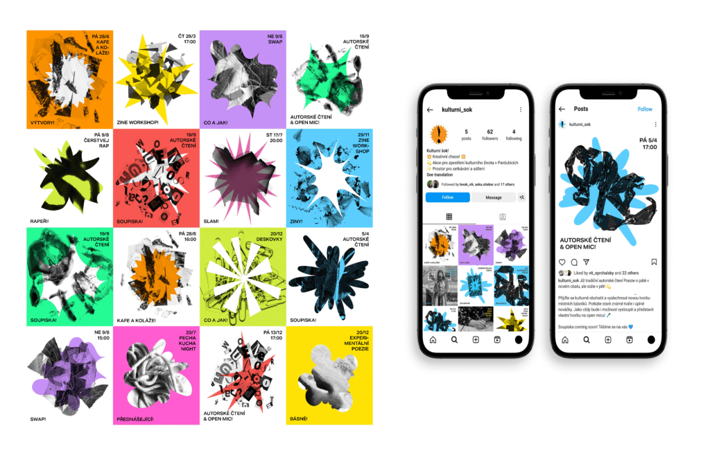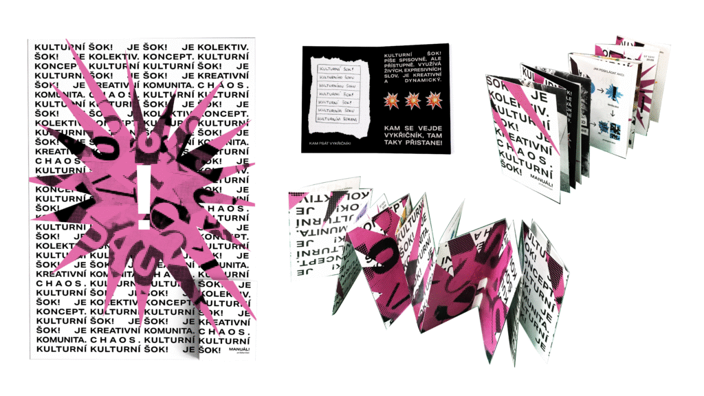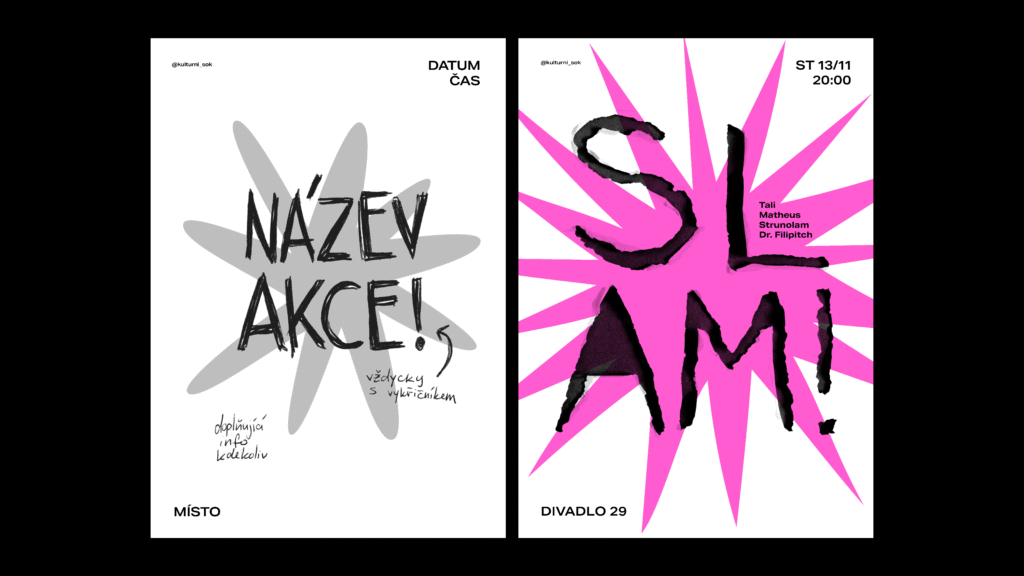 The visual identity of Kulturní Šok! takes heavy inspiration from DIY, as the collective itself is dynamic, creative and a bit rough around the edges. The main goal was to unify the presentation of events so that they were individually recognisable, yet cohesive at the same time.